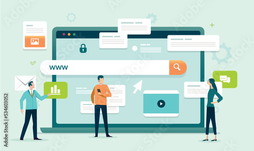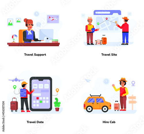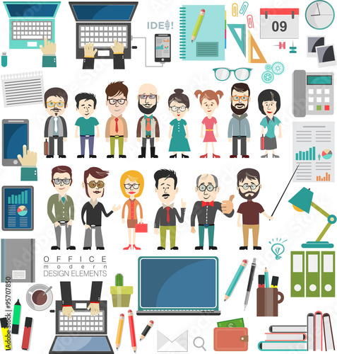 Vector set of banking concept design elements, icons in flat style. Customers carrying out operations with ATM, self-service terminal. Bank employees, guard, safe, cash box, encashment truck.