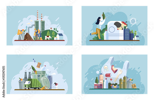 Vector set of banners, posters with different kinds of laboratories and people working there - biologists, chemists, physicists. Scientific research laboratory concept design elements in flat style.