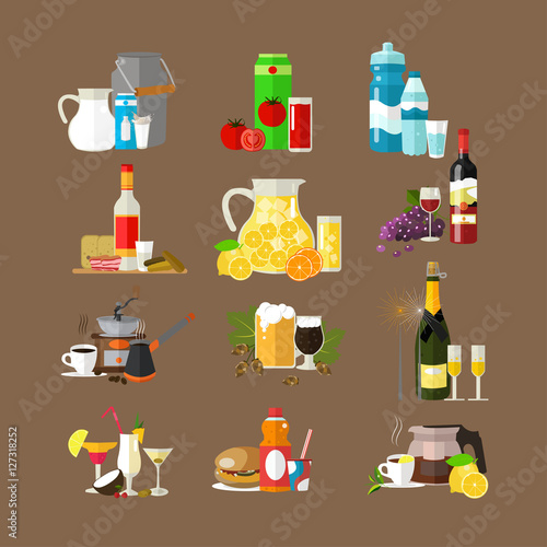 Vector set of beverages icons. Milk, tomato juice, mineral water, vodka, lemonade wine coffee beer champagne cocktails soda tea. Popular drinks. Flat design