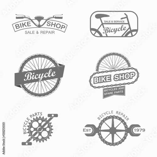 Bike rental badge label logo set. Vector monochrome illustration in retro style. Bicycle rent, shop and repair typography.