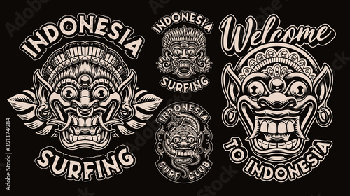 Bicycle service badge label logo set. Vector monochrome illustration in retro style. Bicycle rent, shop and repair typography.