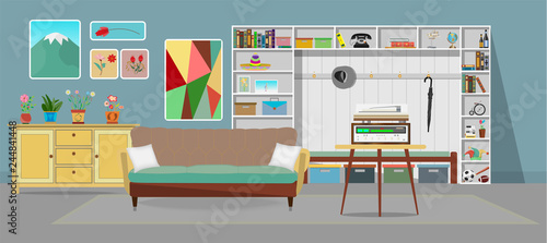Vector set of business posters, banners. Modern office space interior with office furniture and equipment. Flat style design.