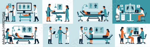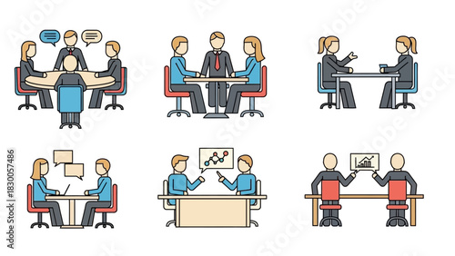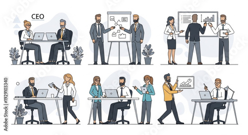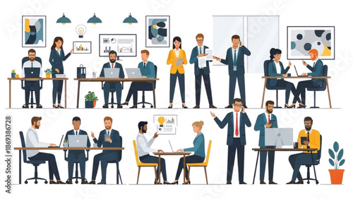 Vector set of office people characters in different kinds of business situations, their workplaces design elements, icons isolated on white background. Flat style illustration.