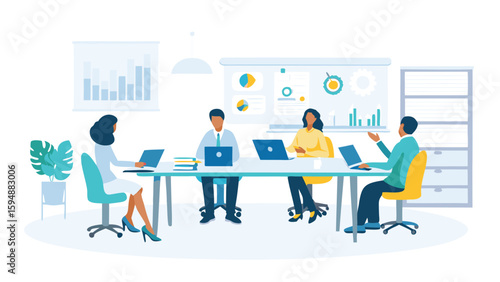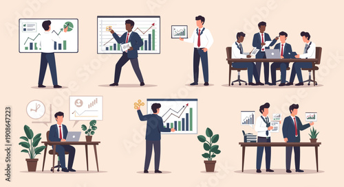 Vector illustration of office people giving presentation, working on computer at workplace. Business people, symbols, icons isolated on white background. Flat style design elements.