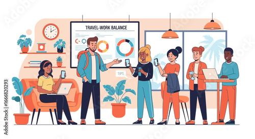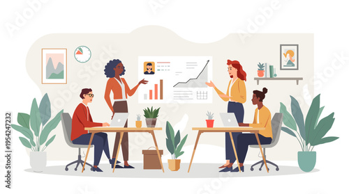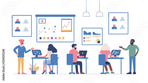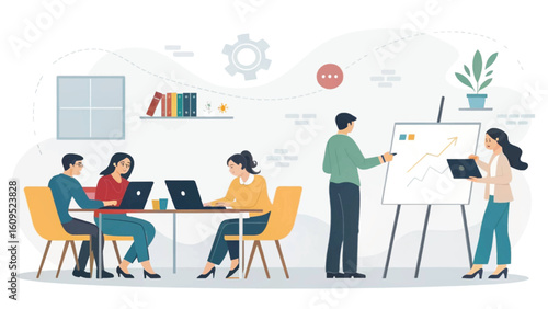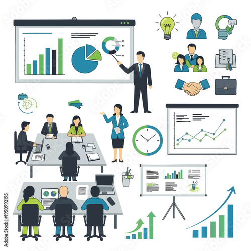 Vector illustration of office people giving presentation, taking part in conference and workshop, making a deal. Business people, symbols, icons isolated on white background. Flat style design.