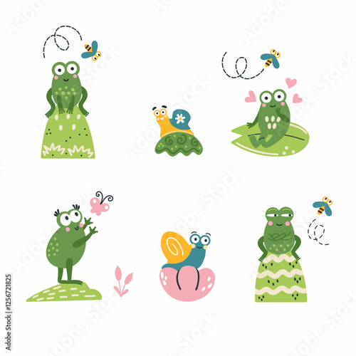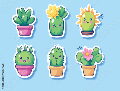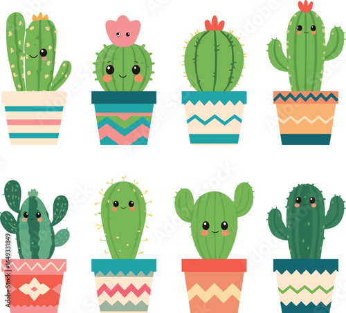 Vector set of cards with cute cacti succulent plant and inspirational quotations. Blooming cartoon cactuses with funny faces in pots on color background with dots, hearts, stars, party pennants.