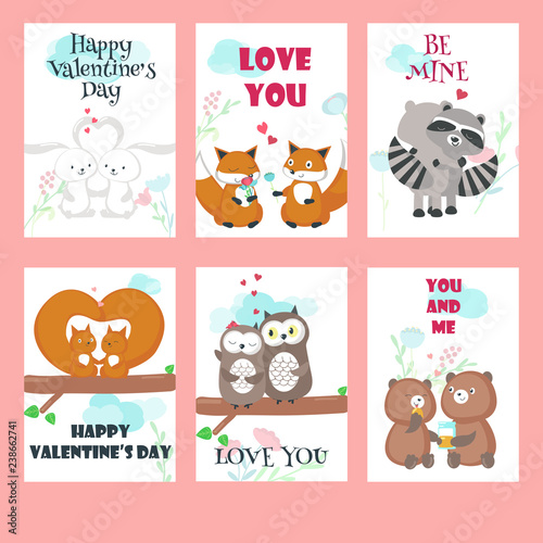 Vector set of Valentine day cards with cute animals couples and inspirational quotes. Happy loving bunnies, foxes, raccoons, squirrels, owls and bears hugging, holding hands, giving flowers.