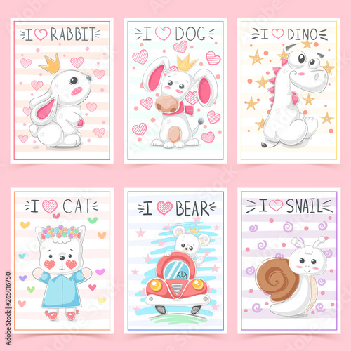 Vector set of cards with fantasy medieval knight, beautiful princess, cute mythical dragon and inspirational quotations. Fairytale middle ages cartoon characters.
