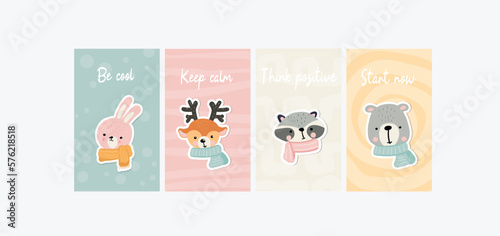 Vector set of cards, flags, notepad sheets with pilot animals and inspirational travel quotes. Cute raccoon fox squirrel bear deer and rabbit owl hedgehog flying on airplane, hot air balloon, balloons