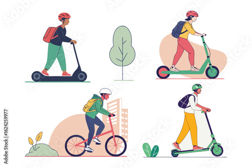 Vector set of cartoon characters isolated on white background. People in park design elements and icons in flat style. Jogging, riding bicycle, walking out dogs.