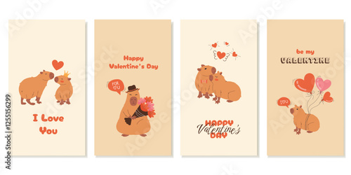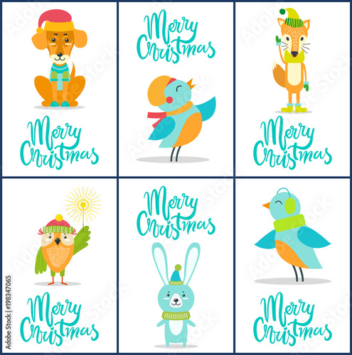 Vector set of Christmas cards with cute animals and holiday greetings. Happy bunny fox raccoon owl deer bear with gift boxes, christmas trees, balls, lights, antler headband, holly berries wreath.