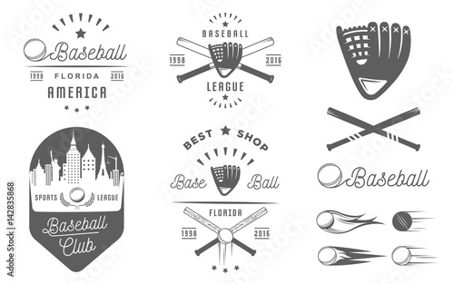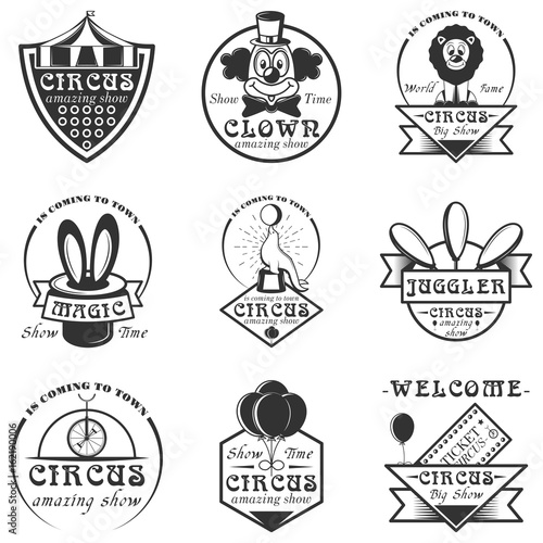 Vector set of circus isolated labels, logo and emblems. Black and white circus symbols and design elements. Clown, arena, tickets, magic hat.