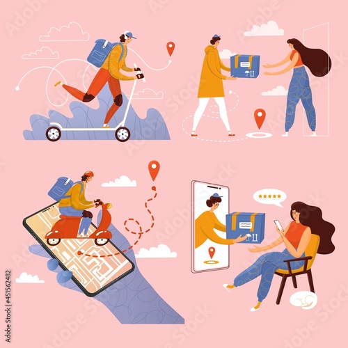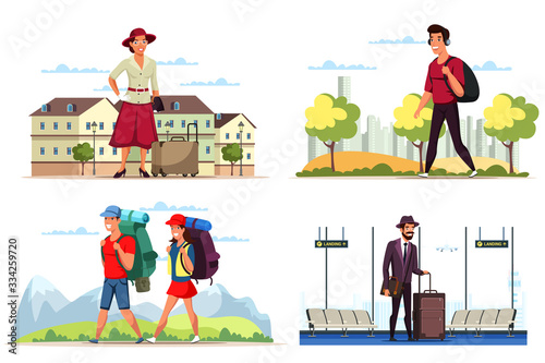 Vector set of city park situation illustrations. Woman and man characters walking in a park, work with laptop on a bench, reading book in hammock, walk with bicycle. Urban summer.