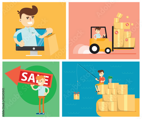 Vector set of cleaning posters, banners. Car, Mini vacuum cleaner, Wash window, Wash floor flat style design elements.