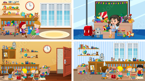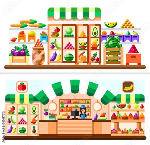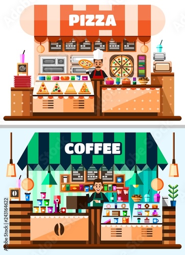 Vector set of coffee shop, coffee house, cafe interior, street cafe with buyers, sellers design elements, posters, banners in flat style.