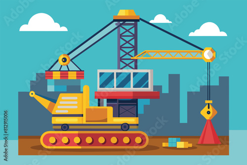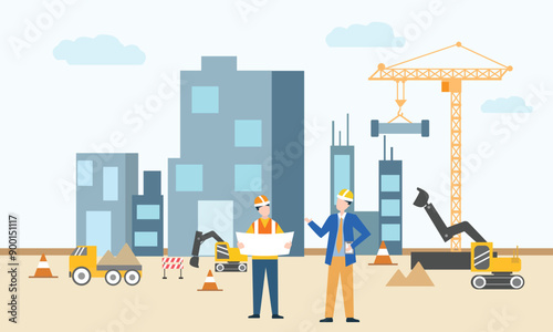 Vector set of construction site objects and tools isolated on white background. Construction building equipment icons in flat style. Crane, bricks, sign, concrete mixer.