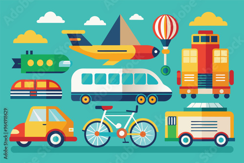 Vector set of delivery vehicle concept design elements in flat style. Delivery by plane, by ship, by truck. Removal of goods from warehouse by forklift. Logistics transportation.