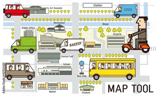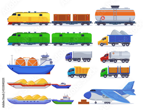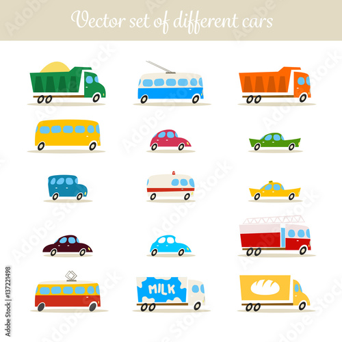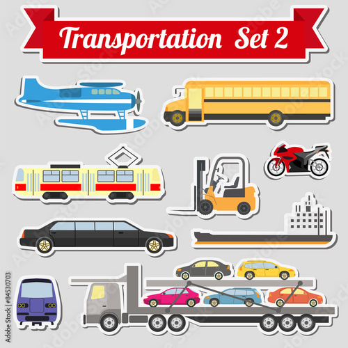 Vector set of different transportation vehicles isolated on white background. Urban transport icons in flat style design. City cars, air plane, ship, train, bus, bicycle.
