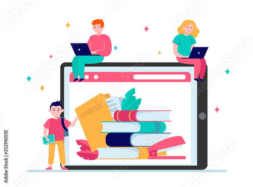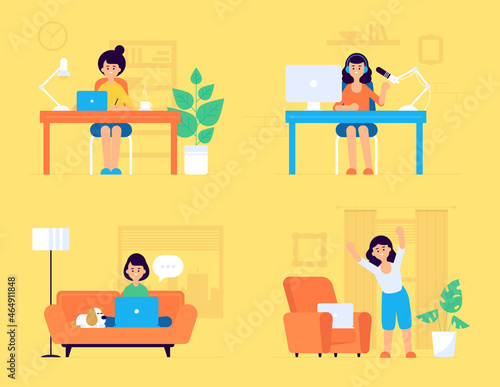 Vector illustration of mother cooking in kitchen, father with ball watching football on tv and children playing games and doing homework. Family people flat symbols, icons isolated on white background