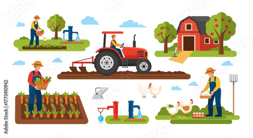 Vector set of farming and cattle breeding, beekeeping, harvesting. Village life and work. Flat design.