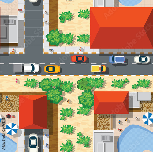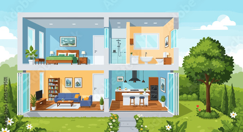 Vector set of father interior posters, banners. Nursery, living room and park interior. Places where parents live, play games, take rest with their sons and daughters flat style design elements.