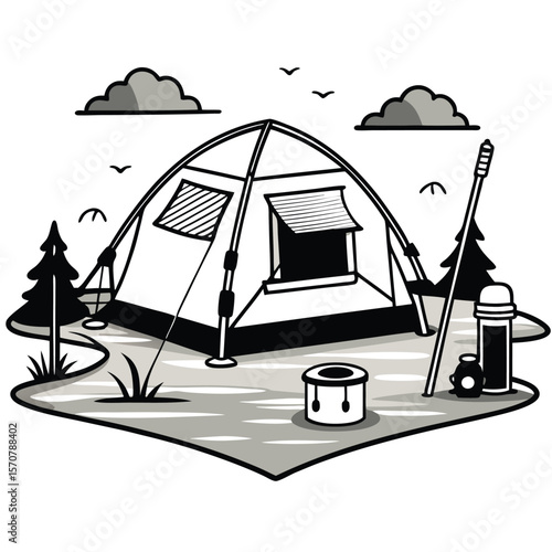 Vector set of fishing objects isolated on white background. Design elements and icons. Fishing rod, boat, tent, boots, hooks.