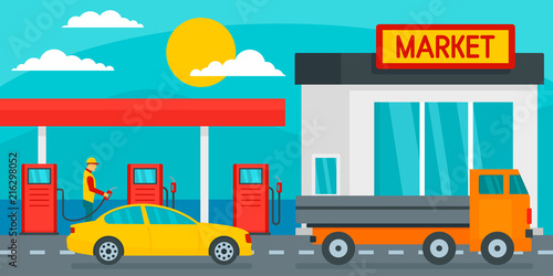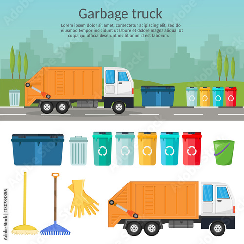 Vector set of food delivery posters, banners. Couriers delivering food by bicycle, truck and by motor scooter. Flower and water delivery. Flat style design.