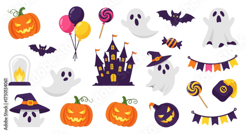 Vector set of halloween party photo booth props and masks. Halloween stickers. Icons set illustration. Pumpkin, hats, monster, skull, holiday costume elements.