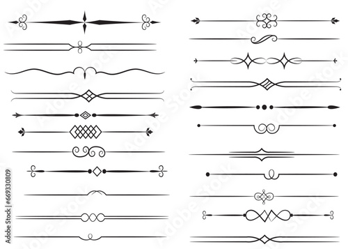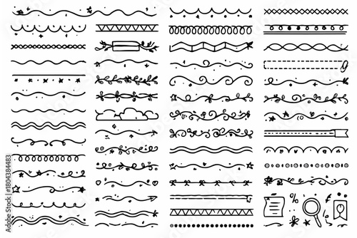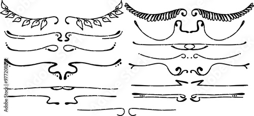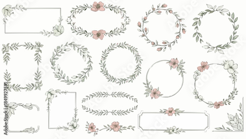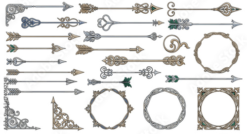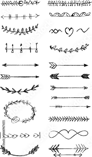 Vector set of doodle decorative symbols. Arrow, wreath, banner, border, frame, floral elements. Hand drawn illustration isolated on white background.