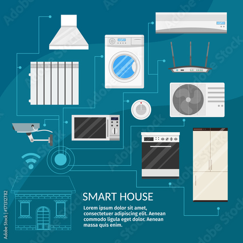 Vector set of home electronics objects isolated on white background. House appliances icons. Washing machine, vacuum cleaner, air-conditioner, tv, radiator, heater