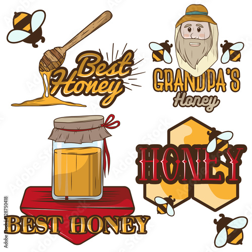 Vector set of honey labels and beekeeping logo. Typographic elements for advertising sweet and fresh natural product, for packaging. Lettering Best honey, Honey, Grandpas honey.