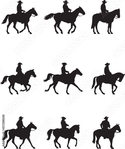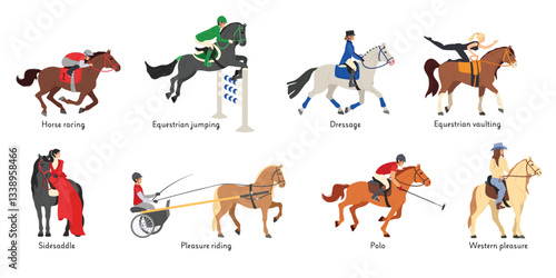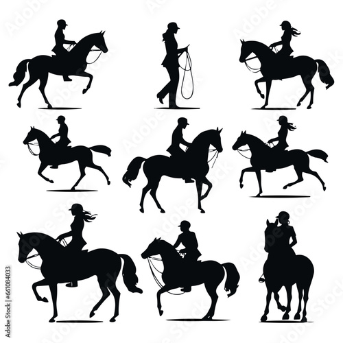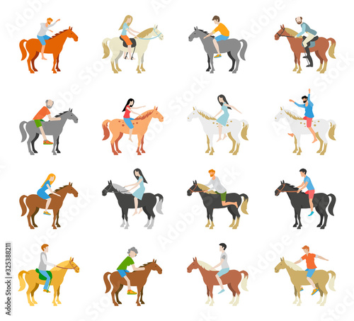 Vector set of horse riders icons. Horseback riding, cowboy with lasso, horse on its hind legs, equestrian sportsman, amateur rider, horsemanship, harness horse riding. Flat design