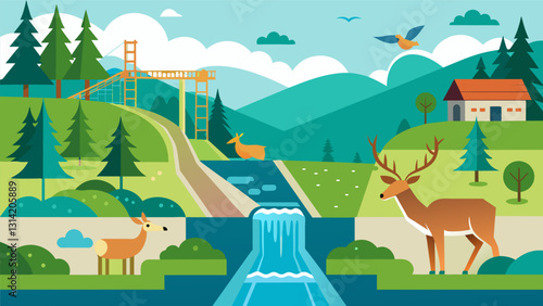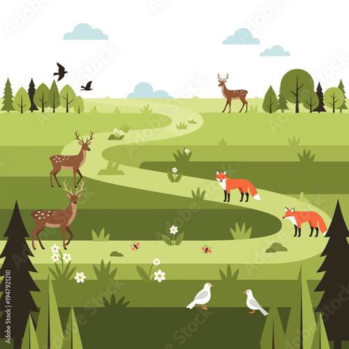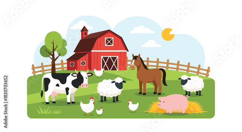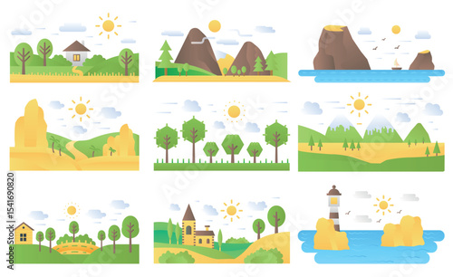 Vector set of horse riding interior posters, banners. Equestrian field with show jumper horses, stable, free horses, countryside landscape design elements in flat style.