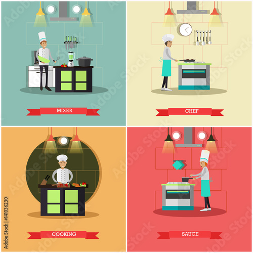 Vector set of hotel square posters. Housekeeping, Reception, Housemaid, Porter flat style design elements.