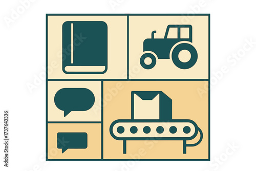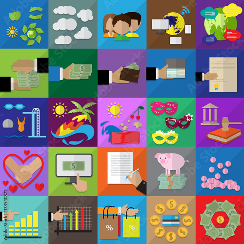 Vector set of house square posters. Garage, Canteen, Children bicycle and Bedroom flat style design elements.
