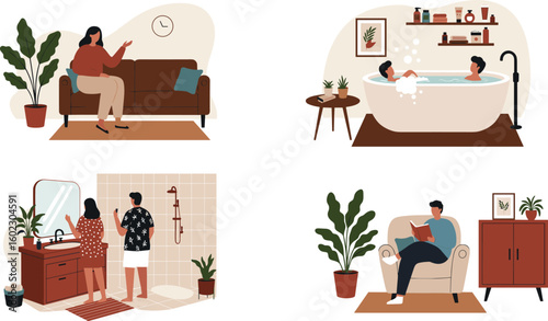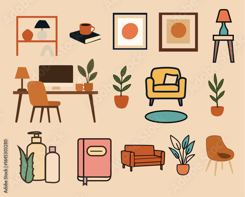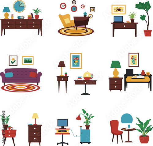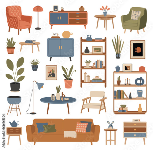 Vector set of living room accessories and furniture. Home modern interior design elements. Hand drawn isolated objects. Chair, fireplace, sofa, storage cabinet, table, shelf.