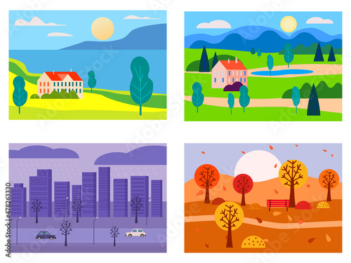 Vector set of lovers interior posters, banners. Places for dating, meeting, walking, celebration festive events. Restaurant or cafe, park, downtown street flat style design elements.