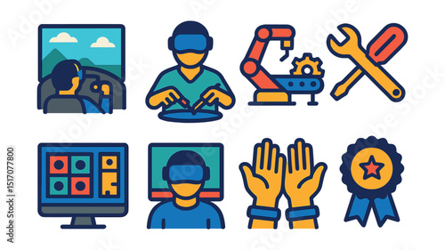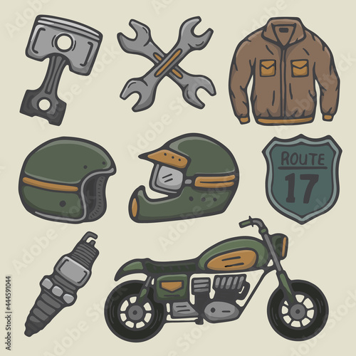 Vector set of motorcycle accessories. Design elements and icons isolated on white background. Sport bike, helmet, gloves, boots, jacket.