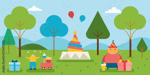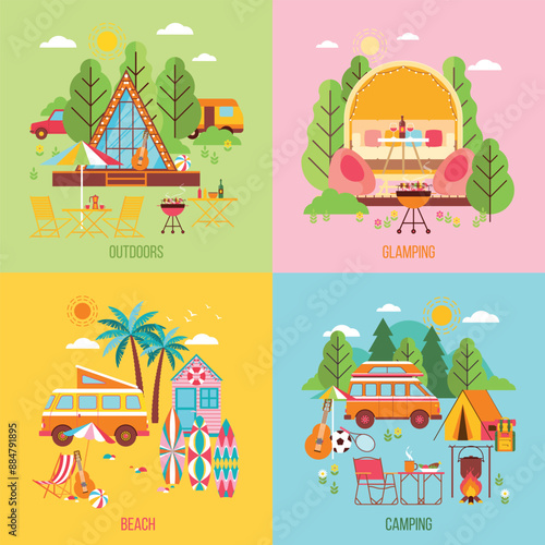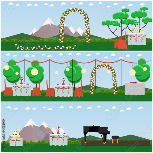 Vector set of outdoors wedding scenery posters, banners. Decorated wedding arch, tables and big cake with three tiers, piano for musicians flat style design elements.