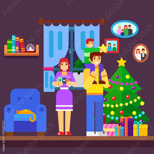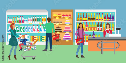 Vector illustration of promoter female and buyer male at supermarket. Online store and home delivery. People shopping symbols, icons isolated on white background. Flat style design.