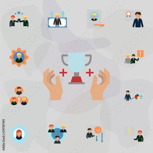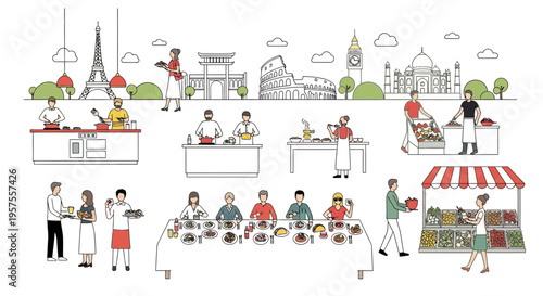 Vector illustration of cashier female, buyers families with shopping carts at grocery store or supermarket. People shopping symbols, icons isolated on white background. Flat style design.