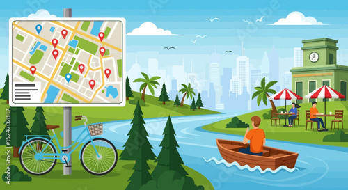 Vector set of photo, video interior concept backgrounds, posters, banners in flat design. Cafe on mountain, theater stage, city street, professional cameras.