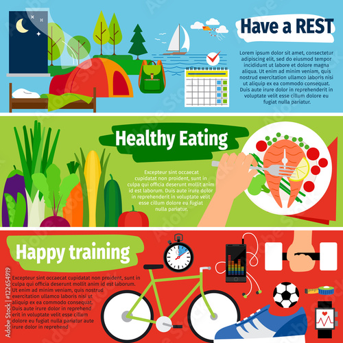 Vector set of photo, video equipment for media, travel concept horizontal banners. GoPro for travel, Interview for news, All for photos and video design elements in flat style.