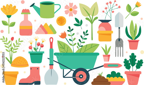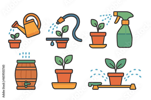 Vector set of potted house plants. Flowers and green home plants in pot. Objects for interior design. Water spray, soil, aloe, cactus.