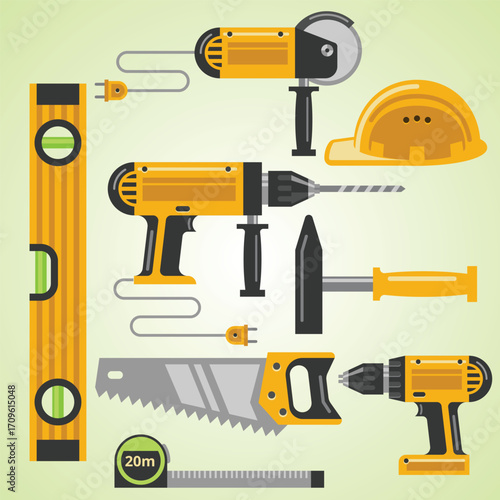 Vector set of power electric tools. Repair and construction working tools. Design elements and icons isolated on white background.