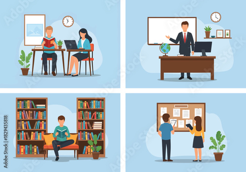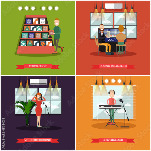Vector set of radio posters, banners. Discs shop, Sound recorder, Voice recording and Synthesizer flat style design elements.