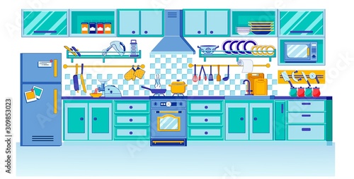 Vector set of restaurant kitchen interior posters, banners. Kitchen utensils and appliances, flat style design elements.