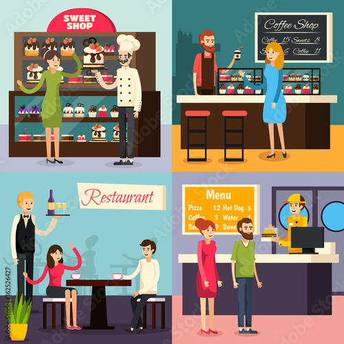 Vector set of restaurant people posters. Cook, Reception, Menu and Guests flat style design elements.