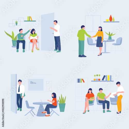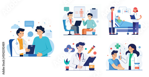 Vector set of biologists, chemists, physicists carrying out experiments isolated on white background. Scientists and laboratory equipment concept design elements, icons in flat style.
