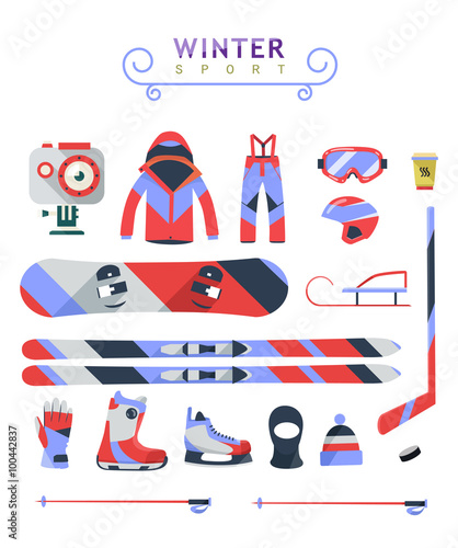 Vector set of Ski and Snowboard equipment icons. Winter sports equipment isolated elements set in flat design style